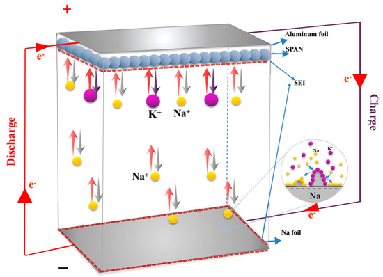 Figure 3 shows a schematic of the discharge–charge process of the Na+/K+ hybrid battery configuration with a metallic Na foil anode, a SPAN composite cathode, and a hybrid solution. During the first discharge process, potassium ions and sodium ions transferred from the electrolyte to the SPAN composite and reacted with sulfur in the SPAN nanocomposite (Equation (4)). Simultaneously, sodium ions dissolved from the Na foil anode (Equation (5)). Conversely, while charging, the K–S and Na–S compounds disassembled, and hybrid cations migrated into the electrolyte. Meanwhile, part of sodium ions in the hybrid electrolyte deposited on the anode because of the lower standard potential (−2.93 V for K/K+ and −2.71 V for Na/Na+ vs a standard hydrogen electrode) [22].