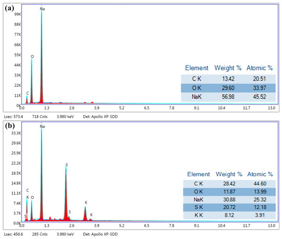 To better understand the working mechanism of this hybrid battery, EDAX mappings of both the SPAN composite cathode and Na anode surfaces were carried out. The elemental overlay results on the Na foil (Figure 4a) showed that no K ions were found on the surface of the anode at the fully charged state of 20 cycles. The existence of C and O explains the oxidation on the surface of Na. The element mapping on the SPAN cathode was also obtained to characterize the composition process with Na+/K+ at the fully discharged state of 20 cycles; the results showed the existence of C, O, S, Na, and K (Figure 4b). The existence of Na and K could be attributed to the formation of Na–S and K–S compounds (Equation (4)), while C, O, and S are the basic elements of the oxidized SPAN composite in the atmosphere. The mass ratio of Na and K is 30.9 wt% and 8.1 wt%, which indicates Na–S and K–S composition–decomposition processes during discharging–charging, respectively. The full reaction of the system is shown as Equation (6):