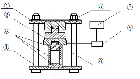 Schematic diagram of the expansion stress test apparatus: ① top plate, ② sensor, ③ sample mold, ④ bottom plate, ⑤ anti-load measuring head, ⑥ constrained screw, ⑦ data acquisition system, and ⑧ transmitter.