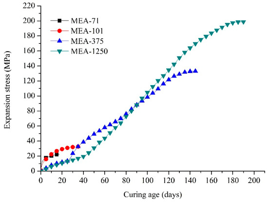 Expansion stress curves of compacted MEA-71, MEA-101, MEA-375 and MEA-1250 cured in water at 40 °C.