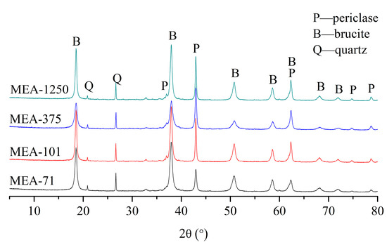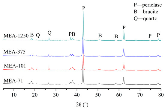Generally, when the expansion stress of compacted MEA was stable, the hydration degree of periclase was about 70% for either the early-type MgO expansion agent or the late-type MgO expansion agent [17,19]. The XRD patterns of compacted MEAs when the expansion stress was stabilized are shown in Figure 6, and periclase was still present. The early-type MgO expansive agents (MEA-71 and MEA-101) hydrated quickly and the expansion stresses developed quickly. However, the late-type MgO expansive agents (MEA-375 and MEA-1250) hydrated slowly at first, and required a long time for the hydration degree to reach 70%. The hydration process of compacted MEAs is consistent with the development of the expansion stress of compacted MEAs.