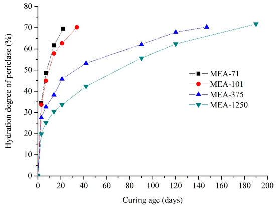 Figure 4 shows the XRD patterns of compacted MEAs cured in water at 40 °C for three days. Brucite existed in all four compacted MEAs, and its peak was more obvious in higher-activity MEAs. Figure 5 shows the hydration degree of periclase in compacted MEA cured in water at 40 °C. At three days, about 34.55% of the periclase in compacted MEA-71 and 33.69% in compacted MEA-101 were hydrated, but the corresponding hydration degrees of compacted MEA-375 and compacted MEA-1250 were 27.52% and 22.84% respectively. The expansion stress of compacted MEA-71 stabilized after 18 days and the hydration degree of periclase was 69.56%. The hydration degree of periclase in compacted MEA-101 reached 69.16% after 34 days. However, more days were needed when the expansion stress of compacted MEA-375 and compacted MEA-1250 tended to stabilize. The hydration degree of periclase in compacted MEA-375 was 69.34% at 147 days, and compacted MEA-1250 required 190 days to reach a hydration degree of periclase of 69.77%.