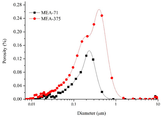 Pore size distribution of compacted MEA-71 and compacted MEA-375 cured in water at 40 °C when the expansion stresses stabilized.