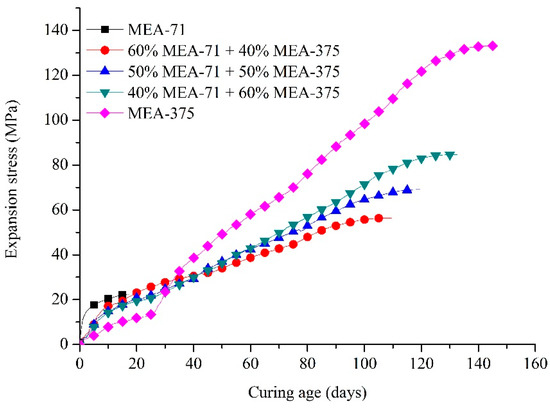 In summary, the expansion stresses caused by blended compacted MEAs were lower than the early-type MgO expansive agent (MEA-71) and greater than the late-type MgO expansive agent (MEA-375) before 18 days. After 34 days, the expansion stresses of blended compacted MEAs were all lower than compacted MEA-375. So, the effect of expansion stresses of compacted MEAs after blending were better than those without blending.