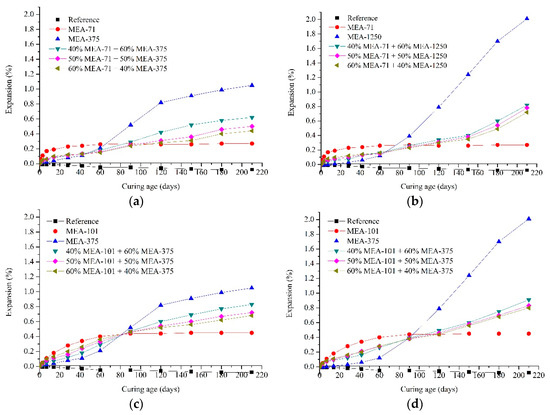 Expansion curves of cement pastes containing 8 wt % of blended MEAs cured in water at 40 °C: (a) MEA71 + MEA-375, (b) MEA-71 + MEA-1250, (c) MEA-101 + MEA-375, (d) MEA-101 + MEA-1250.