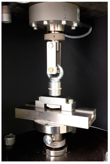 After cementation, specimens were placed in distilled water in an incubator (Hera Cell 150, Heraeus Kulzer, Hanau, Germany) at 37 °C for 24 h and were then mounted in a mastication simulator (CS-4, SD Mechatronik, Feldkirchen-Westerham, Germany) for 600,000 cycles with simultaneous thermocycling between 5° and 55 °C with a dwell time of 60 s. Ahead of the RS test, counterparts in form of the same aluminum bodies had to be placed to enable the fixation in the testing machine. A soft body polyvinyl siloxane (PVS) impression material (Flexitime Fast&Scan Light Flow, Kulzer, Hanau, Germany, Lot.No. R010022) was used as separating medium. Resin (ScandiQuick, SCAN-DIA, Hagen, Germany) was poured through the threaded opening of the counterpart embedding the crown. The specimens were fixed in the universal testing machine (1445 Zwick/Roell, Zwick, Ulm, Germany) and pulled with a crosshead speed of 5 mm/min until bond failure occurred (Figure 8).