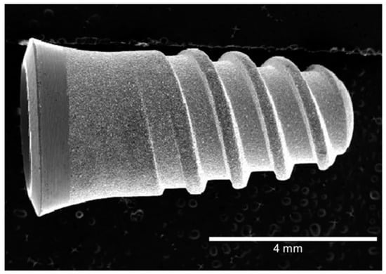 The different alloys were machined into dental implants to perform an in vivo study. Figure 1 shows the dental implant machined with the described alloy (Klockner SA, Escaldes Engordany, Andorra). A shot blasting treatment was performed in order to provide the implants with surface roughness and hence to promote the bonding of the bone with the implant.