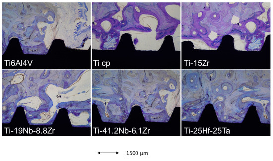 The new bone formed is shown in the bright purple color, whereas old bone is shown in light purple. As can be observed, the Ti cp and Ti6Al4V presented low densities of new bone in contact with the dental implant. The amount of new bone in contact with the implant was shown to be similar in the Ti-15Zr. Nevertheless, these areas of new bone increased in the presence of Nb at 19% and 41.2% content. Finally, the Ti-25Hf-25Ta showed significant amounts of new bone surrounding the bone implant, which was then correlated with the higher BIC values.