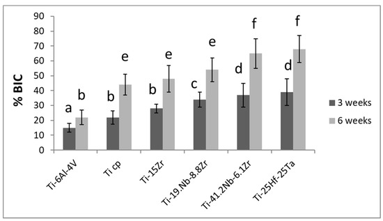 Bone-to-implant contact (BIC) for the different alloys after implant retrieval at 3 and 6 weeks after implantation. Columns labeled with the same letter are not significantly different.