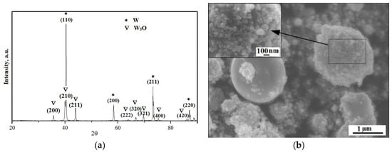 The W nanopowder obtained by means of electrical explosion of conductors with the average size of the particles being d = 130 nm and specific surface area—SBET = 1.7–2.4 m2/g was used as a modifying agent. According to XRD and SEM data, the powder particles had a spherical shape and consisted of 95 mass % of W and 5 mass % of W3O (Figure 1).