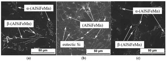According to the optical microscopy data, the iron-manganese phases in a Chinese script-like form and in the form of plates have been discovered in the structure of Al-12%Si alloys along the boundaries of α-Al grains and in the (α-Al + Si) eutectic (Figure 3). The size of the α-(AlSiFeMn) phase is ~1.5–28µm (length), and that of the β-(AlSiFeMn) phase—4–45 µm (length). After the introduction of 0.01 mass % of W, the strongest change of the morphology of α-(AlSiFeMn) and β-(AlSiFeMn) phases occurs. Iron-manganese α-(AlSiFeMn) and β-(AlSiFeMn) phases acquire a compact with a size of ~2.8 μm (length) (Figure 3b). It is impossible to determine their modification based on metallographic data: whether it is α- or β-. However, when introducing 0.1 mass % of W into Al-12%Si alloys, the modification of iron-manganese α-(AlSiFeMn) and β-(AlSiFeMn) phases retains, but the size is reduced by more than 2 times (Figure 3c). More detailed studies on the influence of the W nanopowder on the morphology and the stoichiometric composition of iron-manganese α-(AlSiFeMn) and β-(AlSiFeMn) phases in Al-12%Si alloys will be presented in subsequent manuscripts.