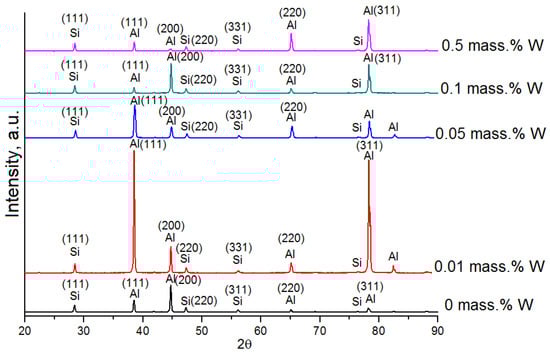 According to the XRD, Al-12%Si alloys before and after the introduction of the W nanopowder are characterized by a solid α-Al solution and a Si phase. Other phases were not detected by this method (Figure 4). After the introduction of the tungsten nanopowder, only changes in the preferred orientation of the grains can be observed in the X-ray diffraction patterns. The volume fraction of iron-manganese α-(AlSiFeMn) and β-(AlSiFeMn) phases in Al-12%Si alloys is small and is not identified against the background of the basic peaks.