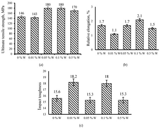 Influence of W nanopowder on properties of Al-12%Si alloy: ultimate tensile strength, MPa, (a); relative elongation, %, (b); impact toughness, (c).
