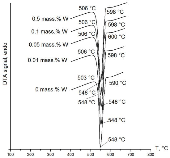 Conducting the DSC-analysis is an indirect confirmation of changing crystallization processes of initial and modified alloys. This analysis is applied for studying phase transformations and mechanisms in the crystallization process of Al-12%Si alloys by different modifying additions [,]. Thus, in order to analyze the effect of W additions on eutectic temperature of the alloys in the present work, the DSC-analysis was carried out. In Figure 7, there is one endothermic peak corresponding to eutectic Si observed on each curve.