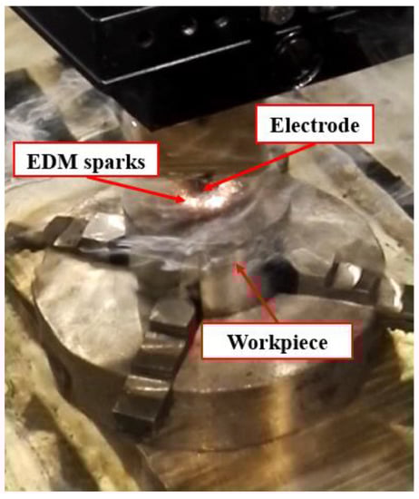 During these tests, 30-mm-deep vertical blind holes with a 14 mm diameter were machined using the graphite electrodes as one of the most common electrode materials for Ti6Al4V []. The generic discharge conditions used for these tests are summarized in Table 3 as recommended by the EDM machine manufacturer for EDM drilling with graphite electrode and Ti6Al4V titanium alloy.