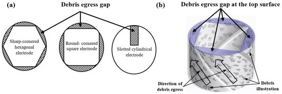 (a) The cross-sectional area and the debris egress gap for three different electrode geometries: from the left to the right, the sharp-cornered hexagonal electrode, the round-cornered square electrode and the slotted cylindrical electrode; (b) a 3-D representation of the debris egress for the sharp-cornered square electrode.