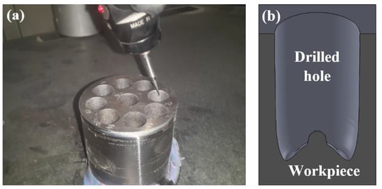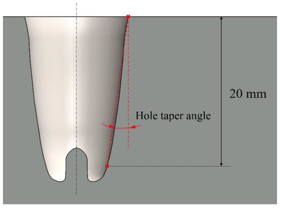 The hole taper usually is an undesirable characteristic, and it is typically evaluated using the hole taper angle. In this work, the inner diameter was measured at a depth of 20 mm, as it was neither possible nor reliable to determine the diameter at the bottom of the hole. A schematic definition of the hole taper angle is shown in Figure 9.