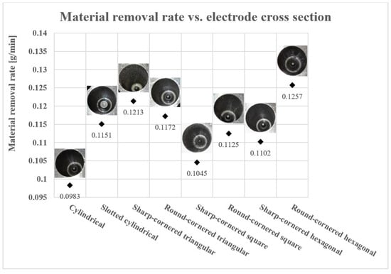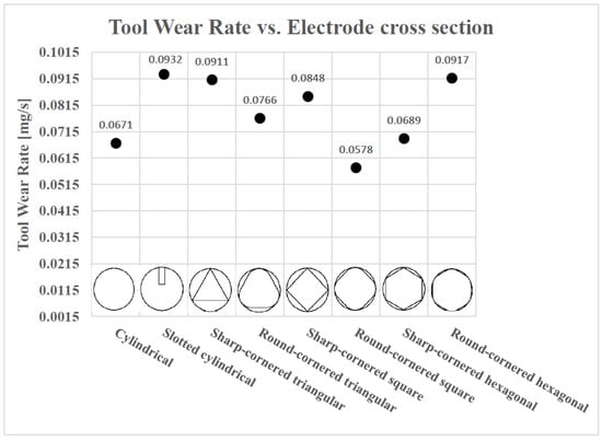 To sum up, one can say that the initial hypothesis for the MRR was proved. Especially, the cylindrical electrode obtained the lowest MRR value when compared with the performance of shaped electrodes. Nevertheless, it is worth emphasizing that, in general, a higher MRR was achieved when round-cornered shaped electrodes were utilized.