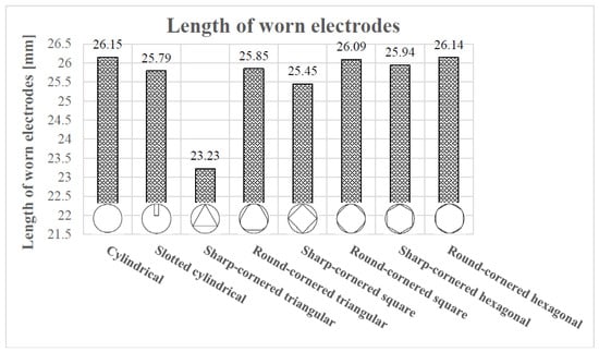 In Figure 6, it is not so difficult to observe that, generally, the TWR is lower in the case of shapes with rounded corners. Apart from that, in order to help obtain a wider perspective of this phenomenon, the length of worn electrodes after each EDM drilling test are collected in Table 5 and plotted in Figure 7.