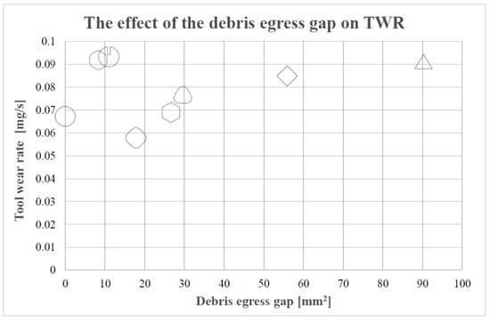 As for the relationship between the TWR and the debris egress gap of the electrode geometry, it is interesting to compare the results presented in Figure 6 with that of Figure 4. Comparing the results presented in both figures, it can be concluded that there is no linear relationship between the TWR and the debris egress gap of the electrode geometry. Nevertheless, if the aforementioned exceptions (round-cornered hexagonal, cylindrical with slot and cylindrical electrodes) are excluded, it can be observed that the TWR increases as the debris egress gap gets larger.