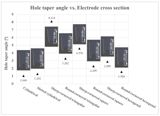 In short, the best result with regards to the hole taper angle was obtained with the cylindrical electrode, which confirmed the initial hypothesis about the hole taper angle. The cylindrical electrode was followed by the slotted cylindrical and the round-cornered hexagonal electrodes, as they present the lowest values of the hole taper angle. In contrast, the sharp-cornered triangular electrode shows the worst results. This is due to the weakness of the electrode geometry and, thus, its tendency to wear axially. Sharp-cornered square and round-cornered triangular electrodes also produced relatively poor results.