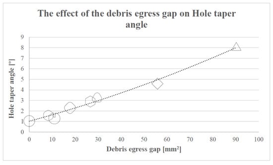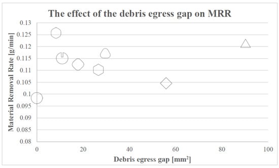 In Figure 13, it can be observed that, in general, the bigger the contact area between the electrode and the processed material is and, thus, the smaller the debris egress gap is, the higher the MRR obtained is during these EDM trials. The observed relationship between the achievable MRR and debris egress gap has two exemptions to its general tendency, namely the results obtained in case of the sharp-cornered triangular electrode and the cylindrical electrode, and the possible reasons for this were formerly discussed.
