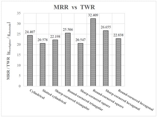 To provide a more comprehensive overview of the electrode’s performance, the ratio of the MRR to the TWR for each electrode is presented in Figure 14.