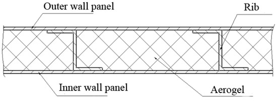 To produce large protective materials for insulation, the typical structure includes a single-layer skin-insulation material, reinforced wall board-insulation material, inner and outer skin insulation material, inner and outer skin-rib-heat insulation material, honeycomb structure-insulation materials, and other structural forms. The structural design of large thermal insulation materials is shown in Figure 1. Structural materials are, respectively, selected from titanium alloys, titanium–aluminum, and high-temperature alloys, which have excellent heat resistance. The aerogel is added in the middle of the wall or in the middle of the inner and outer wall panels, and the thickness ranges from 2 mm to 35 mm to form several groups of structures. In this paper, the structure, preparation, and properties of a double-layer skin-rib (20 mm high)-aerogel (adhesive) were investigated. Compared with the thermal conductivity of other kinds of fiber reinforced silica aerogels, the anti-infrared radiation fibers reinforced silica aerogel composite is lower. In general, the total thermal conductivity of fiber-reinforced aerogel composites is the sum of the three components of solid heat transfer, gas heat transfer, and radiation heat transfer [16]. The anti-infrared radiation fiber has a strong anti-radiation effect and low thermal conductivity. Thus, the anti-infrared radiation fibers reduce the radiant heat transfer of the fiber reinforced silica aerogel composite.