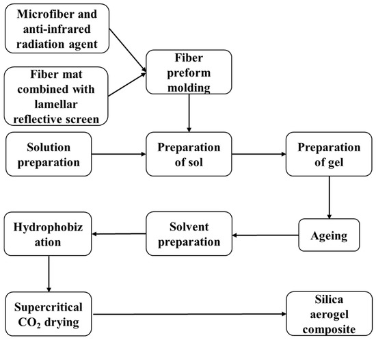 Given the current situation and development needs, silica aerogel materials have shown a special structure of low density, high porosity, and high specific surface area. The heat-resistant, heat-insulating, and mechanical properties of functional composites with silica aerogel (matrix) and fiber (reinforcement) are mainly determined by the microstructure of the aerogel and the structure and composition of the fiber preform. However, the thermal insulation of these fiber-strengthened silica aerogels was compromised. However, aerogels have high brittleness, low strength, and infrared transparency and cannot be directly applied to engineering. Aerogels must be reinforced with an anti-infrared radiation fiber preform. By introducing the anti-infrared radiation fiber preform and controlling the structure and composition of the fiber preform, the mechanical properties and thermal insulation properties of the aerogel insulation material can be improved. Liu et al. prepared a silica aerogel with a thermal conductivity of 0.0486 W·m−1·k−1 [8]. And, the thermal insulation of these silica aerogels was affected by fiber-reinforced. For example, the thermal conductivity of a silica aerogel reinforced by aramid, mineral, ceramic fibers was increased to a corresponding value of 0.0232 W·m−1·k−1 [9], 0.025 W·m−1·k−1 [10], 0.041–0.084 W·m−1·k−1 [11,12,13]. Moreover, White et al. prepared aerogel materials in a few hours using supercritical drying methods [14]. And Saeed et al. using laser-induced gelation method, which can significantly improve the degree of crosslinking and further decreased the processing time of aerogel materials [15].