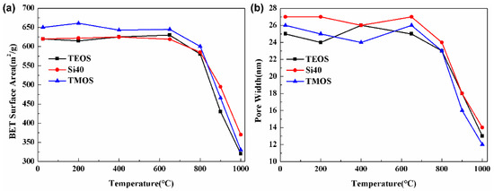 Specific surface area and pore width of silica aerogels prepared by three different silanes systems varied with temperatures: (a) specific surface area and (b) pore width.