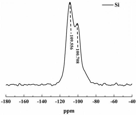 Solid-state nuclear magnetic resonance (NMR) analysis was performed on the samples to further confirm the formation of the network structure and to investigate any anomalies due to alcoholysis, hydrophobization or supercritical (SC) CO2 drying during the preparation of the aerogel. The spectrum obtained with 29Si is shown in Figure 5. The 29Si spectra of cross-linked samples containing silica networks (Figure 5) show two major characteristic peaks, one due to the presence of silane at −100.708 ppm and the other due to siloxane structure at −109.556 ppm. The peaks in other areas are baseline noise. No peak at −52 ppm and −59 ppm confirmed that TEOS had no single bond or double bond with the silica skeleton, which further confirmed the completion of the alcoholysis and condensation reactions. Because the samples were analyzed using supercritical (SC) CO2 drying, no peak representing silicon atoms was found at −93 ppm [21]. This confirms that all the prepared samples have completed the alcoholysis and condensation reactions, thus, forming the silica network structure.