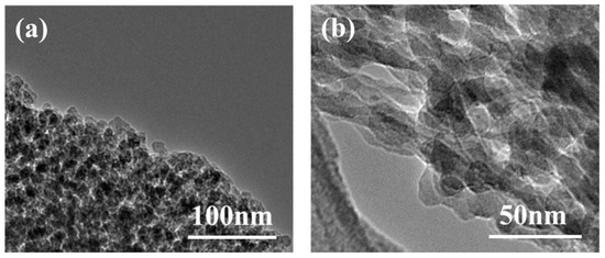 Transmission electron microscopy (TEM) micrographs of SiO2 aerogel: (a) 100 nm; (b) 50 nm.