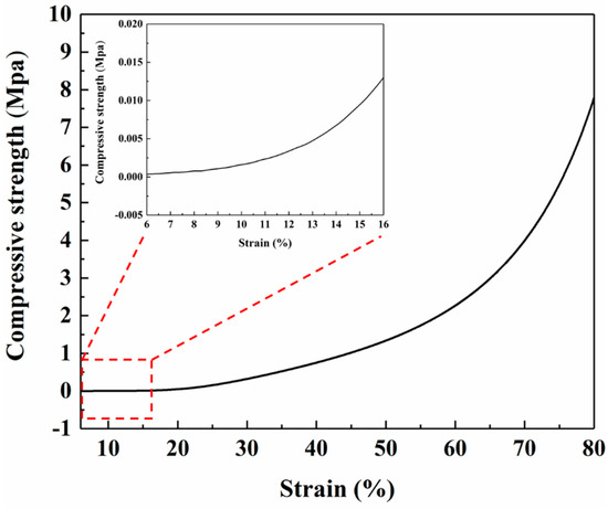 The relationship between compressive strength and strain was obtained by compressive mechanics experiments, as shown in Figure 8. It can be seen from the curve that the numerical change of compressive strength mainly occurs after 6% strain. When the strain was 25%, the rate of increase of compressive strength was obviously large. When the strain was 80%, the compressive strength reached a maximum of 7.71 MPa.