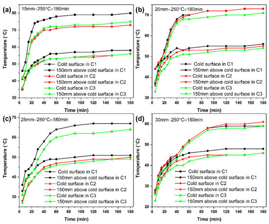 Steady-state temperature table for samples at different cycles and thicknesses. (C1, 2, 3 represent the temperature of the different thermal cycles of the cold surface, C1, 2, 3-150 represent the temperature of different thermal cycles 150 mm above the cold surface.).