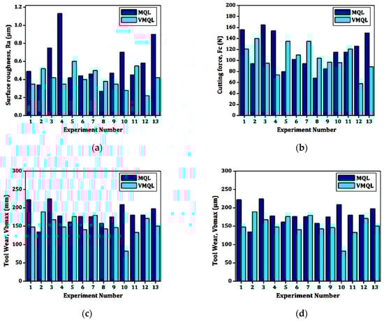 Results (a) MQL and vortex tube-assisted MQL(VMQL) comparisons of Ra, (b) MQL, and VMQL comparisons of Fc, (c) MQL and VMQL comparisons of VBmax, and (d) MQL and VMQL comparisons of cutting power (P).