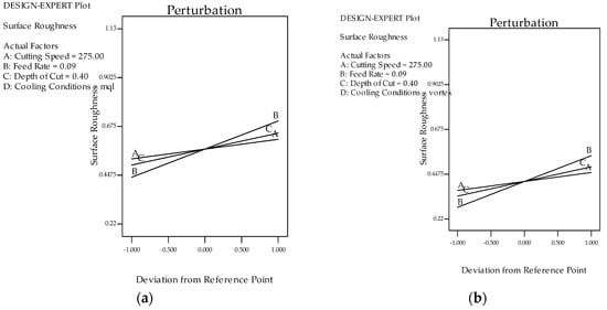 The surface finish had a dominant effect on the performance of the machined part, along with the cost considerations. This contributed towards its inclusion as one of the responses in this study. Figure 2a shows a clear-cut comparison between both of the cooling processes, when taking surface roughness into consideration. The results suggest that the vortex tube-assisted MQL (VMQL) reduced the roughness values at different combinations of input parameters. The reduction in the cutting zone temperatures due to pre-cooled air accounts for this significant reduction in the surface roughness (Ra) values. The higher cooling may also have drastically reduced the thermal softening of the material, which further affected the frictional forces between the work and the insert []. The combined effect of all of the above-mentioned factors justifies the attained values of the surface roughness. In addition to this, Figure 2a shows the peaks formed at the higher levels of feed, which is common to both of the cooling techniques, but with different magnitudes. This led to the conclusion that VMQL becomes more effective at greater values of feed. Equations (1) and (2) were generated for the surface roughness (Ra). Figure 3a,b indicates the perturbation curves for the MQL and VMQL cooling, respectively. It can be clearly seen that the feed (represented by “B” in the figure) has the maximum effect on the surface roughness (Ra), while the speed (represented by “A” in the figure) and depth of cut (represented by “C” in figure) have minor effects. This observation explains and validates why the model states them as insignificant factors. It could also be seen that there was a noticeable reduction in the surface roughness when the vortex cooling was engaged.