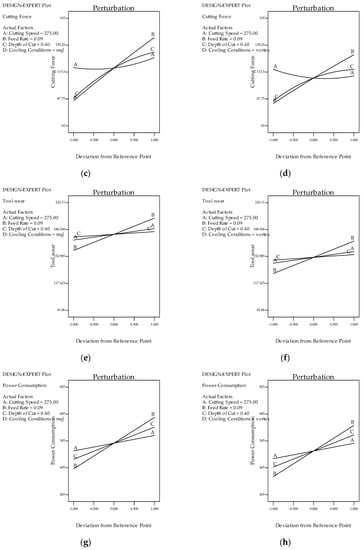 (a) Perturbation analysis for Ra under the MQL technique; (b) perturbation analysis for Ra under the VMQL technique; (c) perturbation analysis for Fc under the MQL technique; (d) perturbation analysis for Fc under the VMQL technique; (e) perturbation analysis for VBmax under MQL cooling; (f) perturbation analysis for VBmax under the VMQL technique; (g) perturbation analysis for P under thermal technique; (h) perturbation analysis for P under the VMQL technique at vc = 275 m/min, f = 0.09 mm/rev, and ae = 0.4 mm. (A = cutting speed; B = feed; C = depth of cut, where the X-axis represents the coded values and the Y-axis represents the selected responses) [].