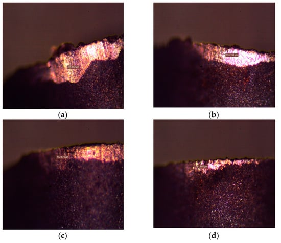 The optical inspection of the worn surfaces provides the necessary information to quantitatively and qualitatively evaluate the tool surfaces []. This measurement is considered a non-destructive method, which can be performed with different devices, as per the accuracy requirements. The most common are the scanning electron microscope (SEM), white light interferometric (WLI) microscopy, confocal microscopy, optical diffraction technique, and the stylus methods. Therefore, the optical micrographs and surface profiles offer great information related to the dominant wear mechanisms [].