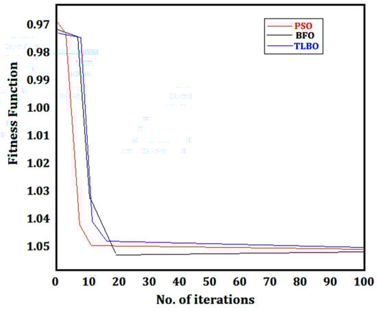 Similarly, in case of the BFO, the parameters were selected on the basis of the available literature. S represents the number of bacteria and was kept at 55. The number of chemotactic steps was taken as 120, while the reproduction steps were maintained at 5. Like the iterations in the PSO process, the numbers of chemotactic steps controlled the convergence characteristics of the process. The optimal results were obtained by fixing the probability of elimination and dispersal at 0.1 as shown in Table 6. Figure 5 also depicts the convergence graph for BFO, and it accounts for its stability and precision. The TLBO technique consists of a continuous repetition of the parameters (like the number of iterations or the size of the population). Such a continuous process ultimately leads to an optimal solution. The updating of the solutions takes place in both the learner and the teacher phases. Moreover, while commencing with the step for the duplication elimination, the existence of duplicate solutions leads to their random modification. Therefore, the main calculations in TLBO are as follows: (2 × Iteration number × size of population) + (duplicative elimination). The counting of the function evaluations is accomplished through the above-mentioned formula. For the present work, 2000 evaluations were performed in order to eliminate the duplicity.