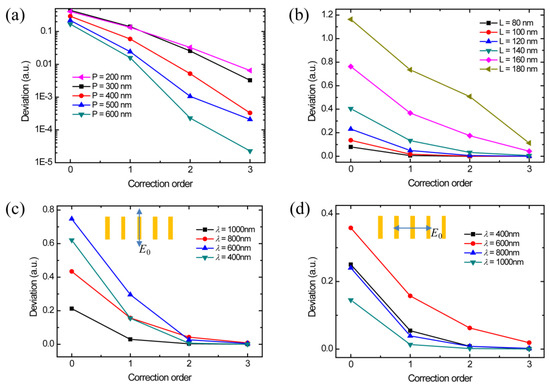 The coupling factor is one important parameter to the convergence of the coupling correction. The calculation time and the accuracy need to be properly balanced. The coupling intensity depends on the geometric parameters of the structure design, wavelength, and polarization. In the above cases, the geometric parameters include the length, width, height, and period of optical antennas. The performance of such a metallic rod design is not sensitive to the width and height [21]. The period of the optical antenna directly affects the distance between two antennas. The coupling is strong at a short distance and weak as the distance increases. It is due to the electric field radiated by subsources, which can be estimated as inversely proportional to the square of the distance. The antenna is considered as a point source. Figure 3a demonstrates that the coupling intensity reduces when the period increases. At the periods of 200 nm and 300 nm, the coupling intensities are almost the same, which is attributed to the near-field coupling at a deep subwavelength distance. Theoretically, when the period of the antenna is large enough, the coupling does not need to be considered. However, the efficiency and the maximum controllable special frequency would be affected at a large period. To fully control the wave factors in free space, the period of the optical antenna cannot be designed to be larger than the wavelength. Therefore, the coupling in the metasurface design cannot be avoided. The length of the optical antenna is another factor affecting the coupling, which affects the antenna resonance. The length of the optical antenna is usually at deep subwavelength scale for the metasurface design, which is shorter than the resonant length in the dipole model. Therefore, the increasing of the length of the antenna leads to stronger resonance and also affects its coupling. As shown in Figure 3b, the coupling of longer nanorods is stronger so that a higher order of correction is required. Figure 3c,d show the deviation caused by the coupling at different wavelengths and polarizations for comparison. The highest deviation always happens at the wavelength around 600 nm, which is at the plasmonic frequency of gold. Since the deviation in both polarization illuminations can be corrected with good convergence, the light field of common optical antennas can be restructured by this new coupling correction method.