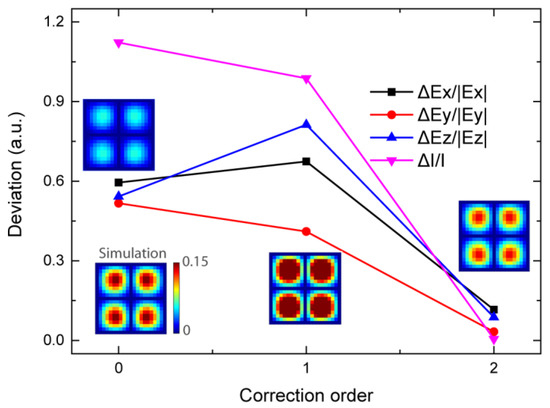 In a more complex system with a large number of antennas, it is impossible to calculate all the coupled electric fields for all the antennas. However, the deviation of the electric field can be greatly reduced by the coupling correction via our proposed method to calculate only a limited area. For instance, a periodic optical antenna array is simulated. As shown in the insets of Figure 4, the electrical fields indicate the distribution through numerical simulation and the restructured field distribution via the field superposition. The results indicate that the field distributions calculated by different methods are similar, but the intensity is greatly changed. Without the correction, the radiated field is very weak. Hence, the deviation is as high as 112.2%. With the first-order correction, the deviation is slightly reduced to 98.7%. After the second-order correction, the deviation of the calculated electric field intensity is rapidly reduced to 0.5%. The restructured distribution and intensity of light match the simulated results very well. It is obvious that the coupling correction with the limited orders is efficient for metasurface design with a large number of elements.