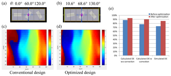 Schematics and simulated phase distributions of the Ex of (a,c) the conventional design and (b,d) optimized design of a meta-deflector. (e) The diffraction efficiency improvement at the calculation with and without the correction and simulation.