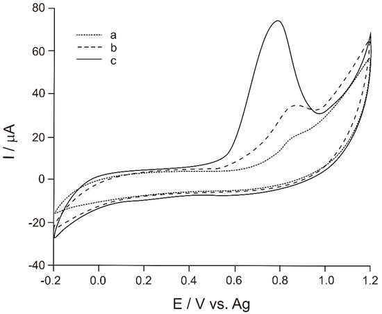 Figure 2 illustrates the cyclic voltammograms (CVs) of CSPE (curve a) recorded in a 10−4 M Tyr solution (0.1 M phosphate buffer, pH = 7) versus the pseudo-reference Ag electrode. As it may be noticed in Figure 2, all modified electrodes have a higher anodic peak and lower peak potentials as compared to the unmodified CSPE.