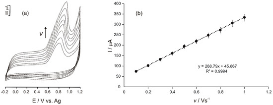 The cyclic voltammograms of Ty/PtNP/GPH/Chit-CSPE immersed in a 10−4 M Tyr solution (0.1 M phosphate buffer, pH = 7) were recorded at different scanning rates in the range of 0.1–1.0 V·s−1. The results obtained are shown in Figure 4a,b.