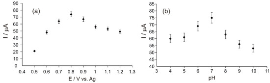 In order to obtain the optimal value of the applied potential, the amperometric signal of Ty/PtNP/GPH/Chit-CSPE towards Tyr was determined under continuous and constant stirring of the sample. The applied potential is one of the most relevant parameters, which significantly influences the electrochemical signal of a biosensor, affecting both sensitivity and selectivity. The most intense response of the biosensor was obtained at +0.8 V vs. Ag (Figure 5a). Therefore, the sensitivity of the sensor is maximum for Tyr detection when this value of the potential is applied.