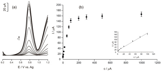 The linearity range between the anodic peak current and the Tyr concentration of the solutions analysed was 0.1–100 μM, as it may be noticed in Figure 6b (insert).