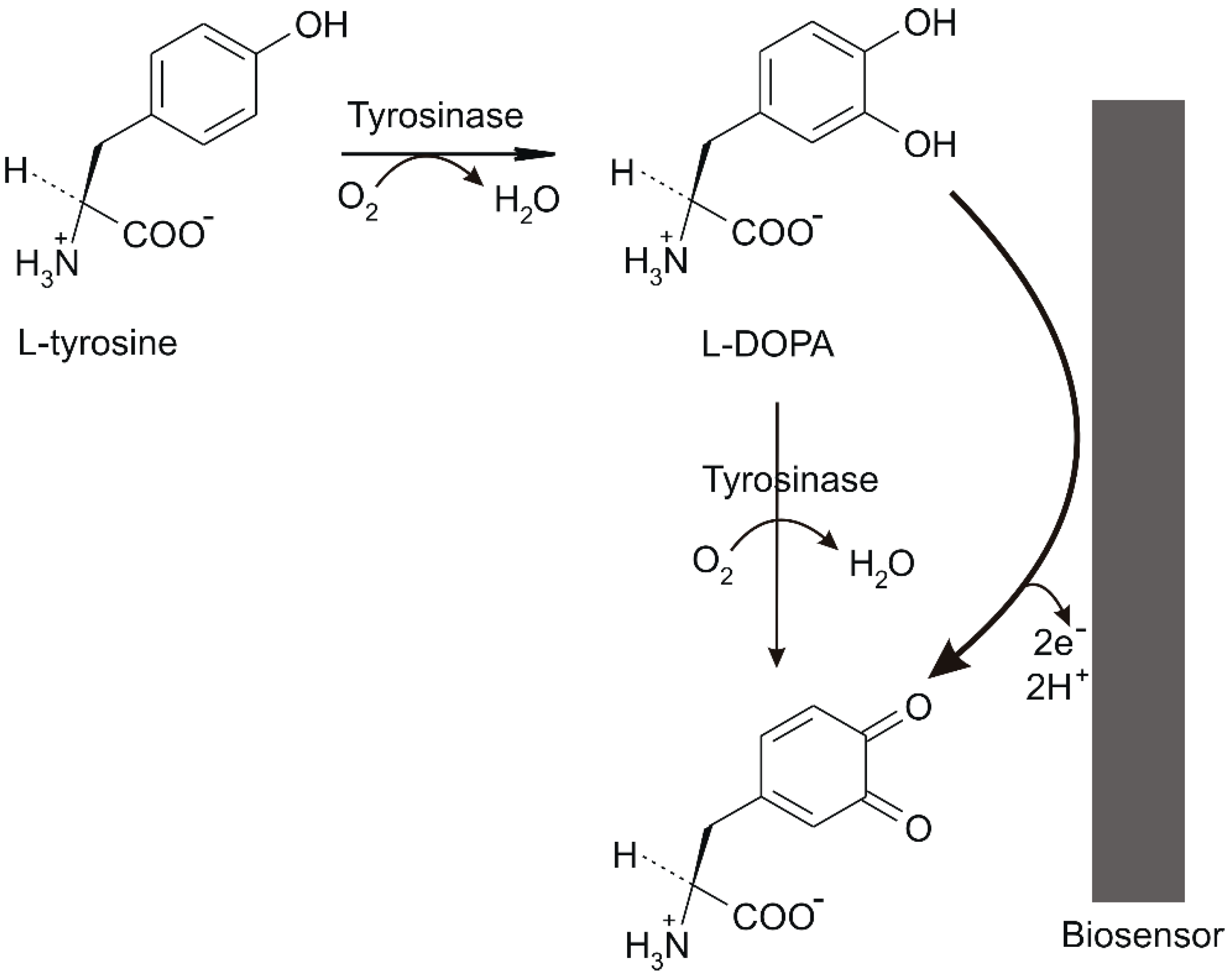 - Li, Y.J. Optical Determination of L-Tyrosine Based on Eggshell Membrane Immobilized Tyrosinase. J. AOAC Int. 2010, 93, 1912–1915. [Google Scholar] [PubMed]