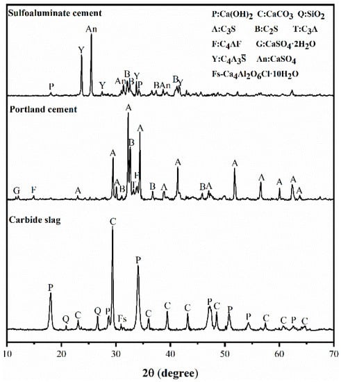 The mineral composition of all materials was determined by X-ray Diffraction (XRD), and the results are shown in Figure 1. Carbide slag was composed of portlandite (Ca(OH)2), calcite (CaCO3), silicon dioxide (SiO2) and vestiges of hydrocalumite, as known as Frieded’s salt (Ca4Al2O6Cl·10H2O). XRD patterns of Portland cement revealed the presence of tricalcium silicate (C3S), dicalcium silicate (C2S), tetracalcium aluminoferrite (C4AF), tricalcium aluminate (C3A) and a little gypsum (CaSO4·2H2O). There are four mineral phases in sulphoaluminate cement, including ye’elimite (C4A3S), dicalcium silicate (C2S), anhydrite (CaSO4) and portlandite (Ca(OH)2).