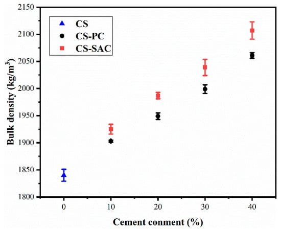 At 28 days of curing age (Figure 3), the bulk density of blended mortars increases from 1840 kg/m3 to 2061 kg/m3 or 2107 kg/m3, as the content of Portland cement or sulphoaluminate cement is 40%. Comparing two types of blended mortars, it can be indicate that the bulk density of CS-SAC blended mortars is larger than that of CS-PC blended mortars with the same cement content.