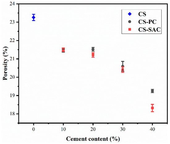 Conversely, the porosity of blended mortars presented a decreasing trend with the increasing of cement content, especially for CS-SAC blended mortars, as shown in Figure 4. The porosity of mortars was similar to that of lime-cement mortars, which varied from 18% to 26% [12].
